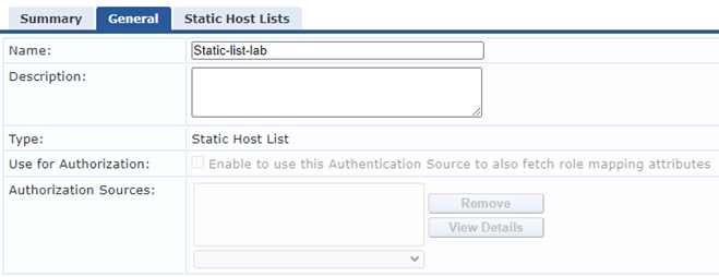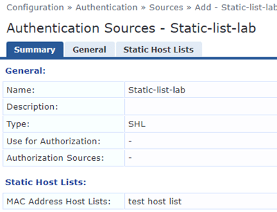 The static host list can be used as an authentication source for a MAC-auth service or an authorization source for an 802.1X service. Here we’ll create an authentication source.