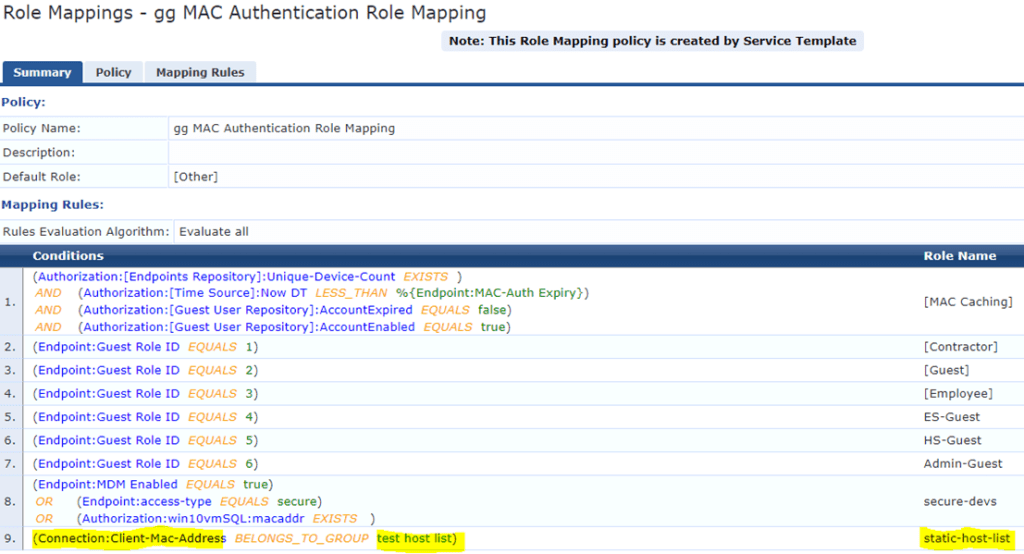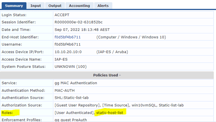Now when we’ll test it with a device that matches the MAC auth service which also matches with the role-mapping entry