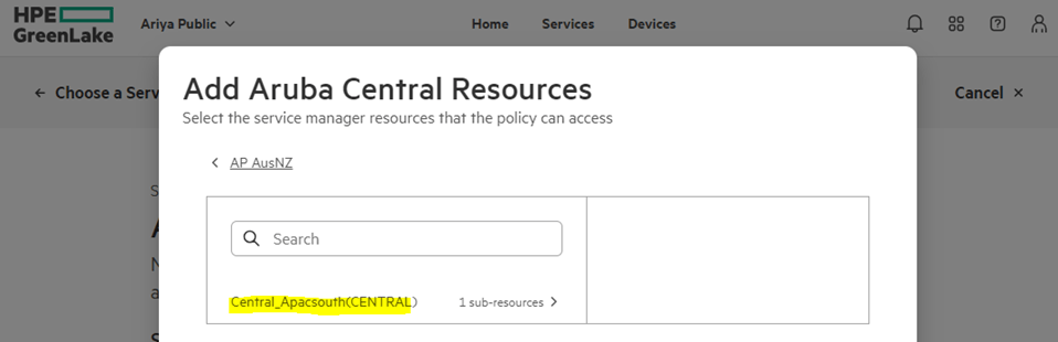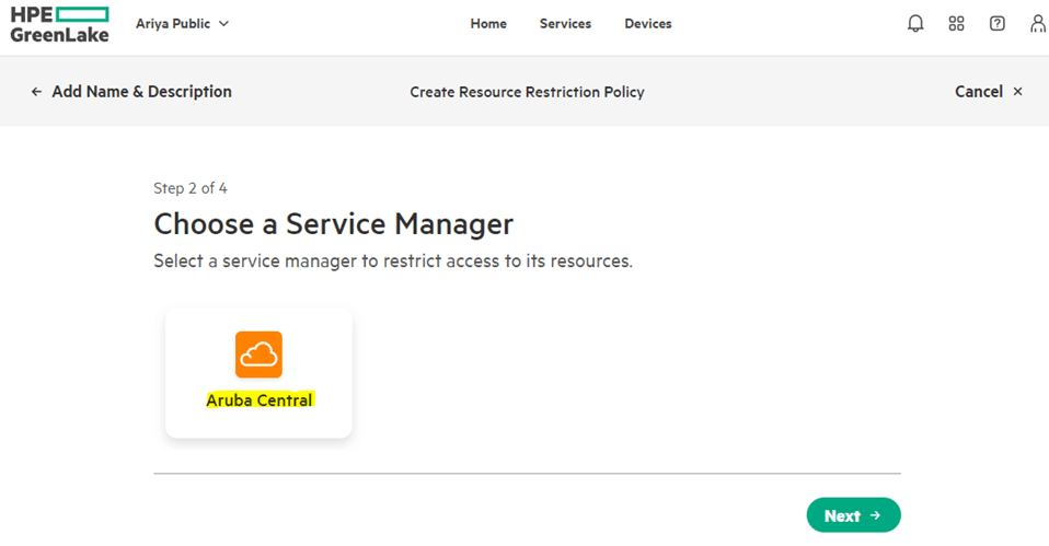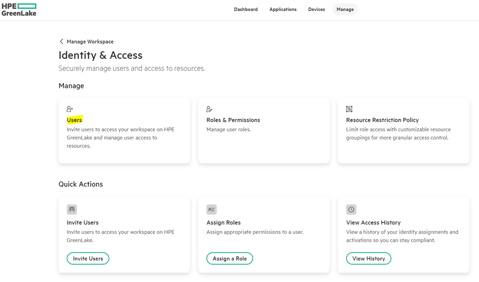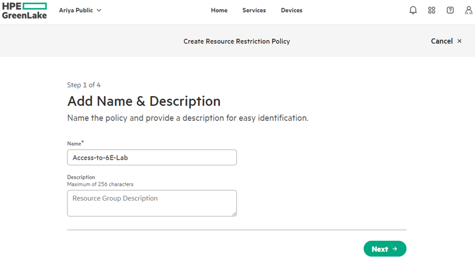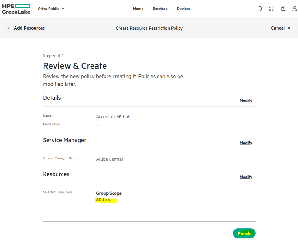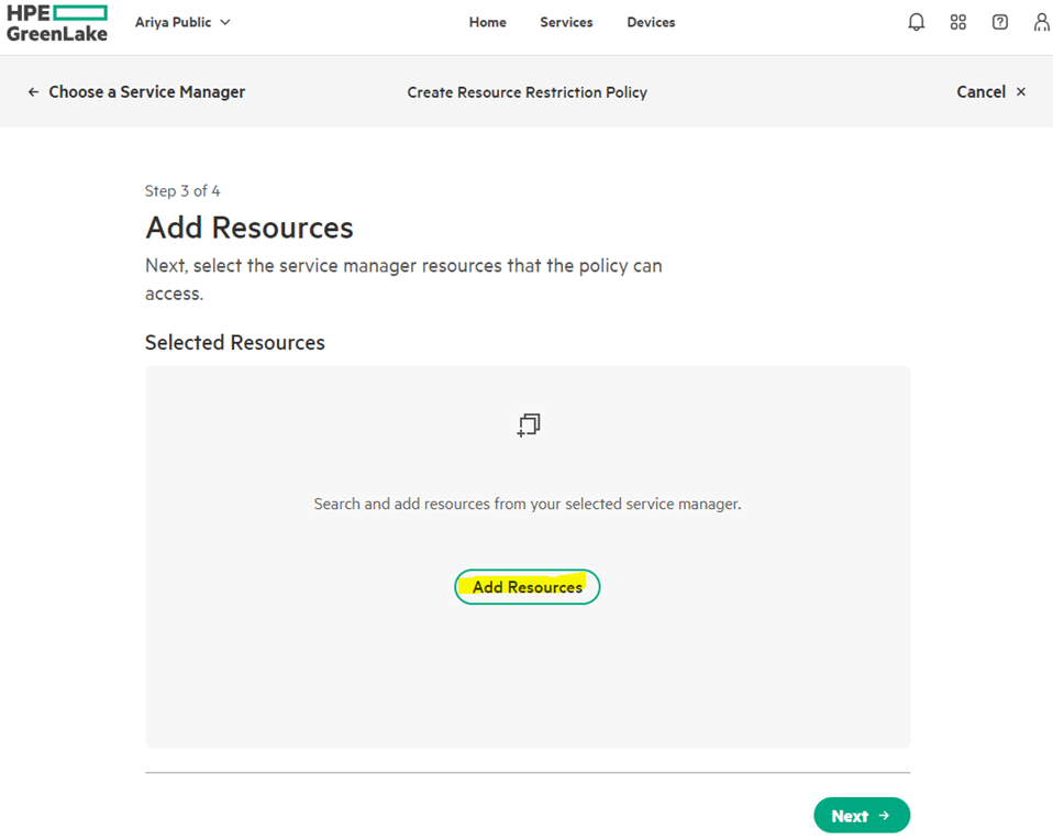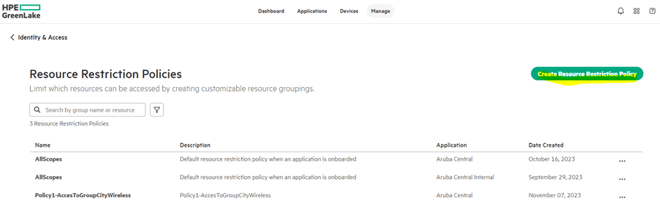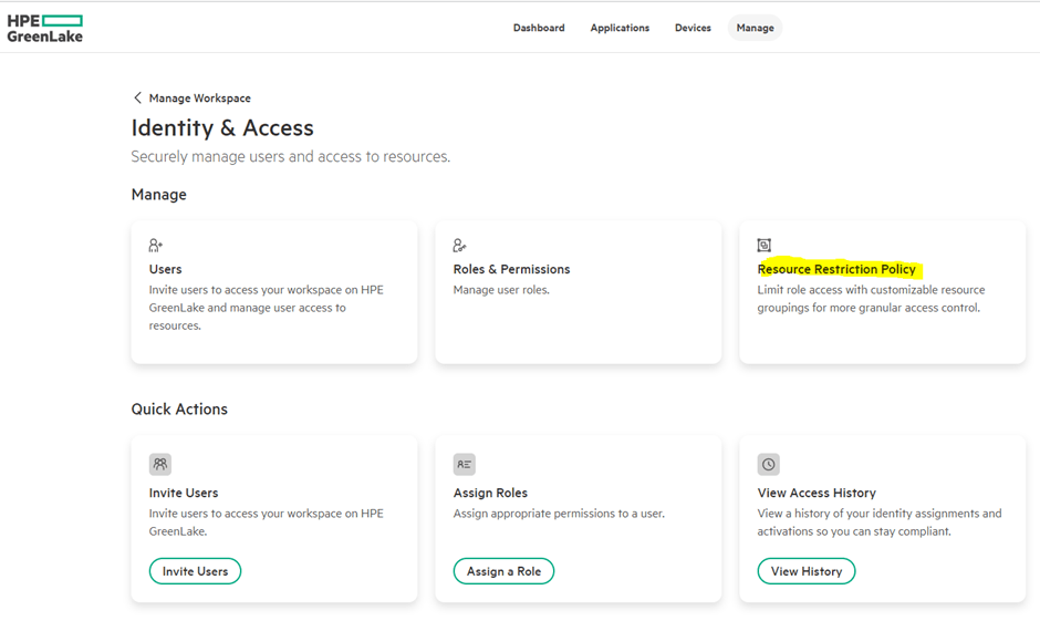 This is done in GreenLake platform. We’ll start from Manage->Manage Workspace->Identity & Access-> Resource Restriction Policies