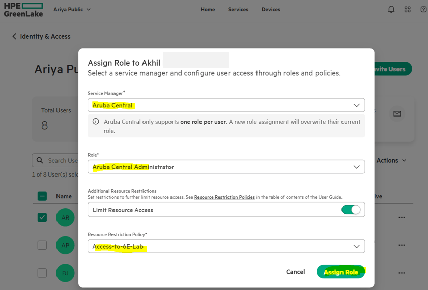 Now when this user accesses Aruba Central, he will only have access to 6E-Lab group.