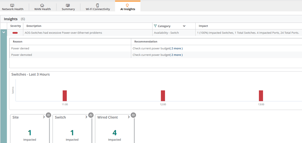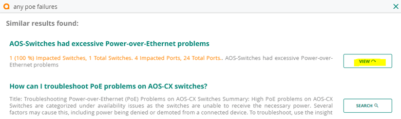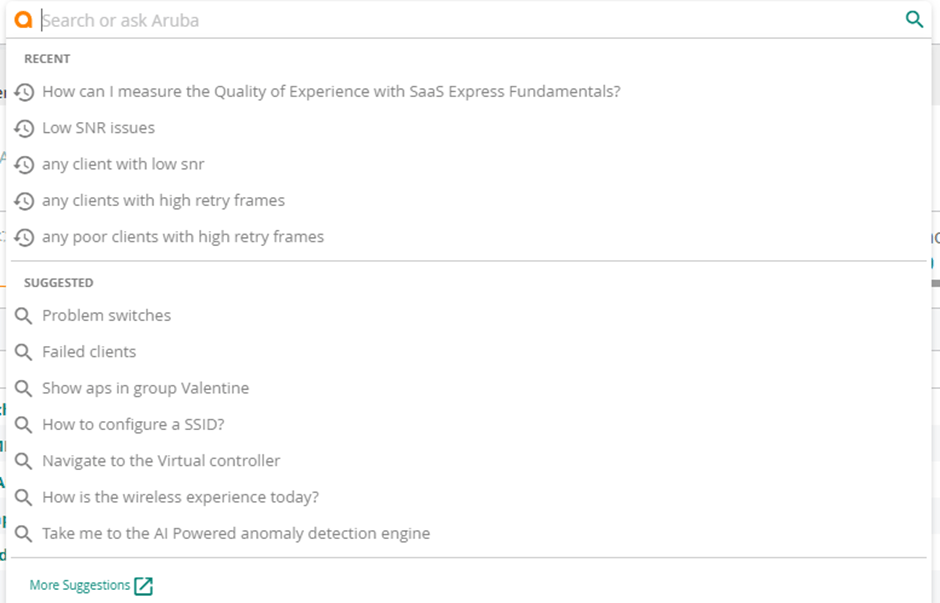 When you click on the AI search in Aruba Central , you can see your recent searches and some suggestions based on your Aruba Central configuration. Like if you only have APs and not LAN switches or gateways, then the suggestions are around AP.