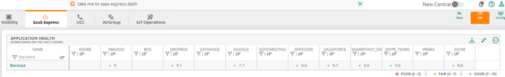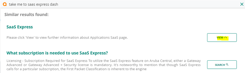 Here is another example, imagine you are new to Aruba Central and don’t know for example, how to go to SaaS Express dashboard. You know the senior members of the network team have mentioned it, and that it is configured but you don’t want to ask them to show you. So you just search for it.
