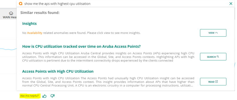 Aruba Central uses this approach to provide fast, accurate, relevant response, auto fill AI search that is protected by railguards and an opportunity to provide feedback to the AI search.
