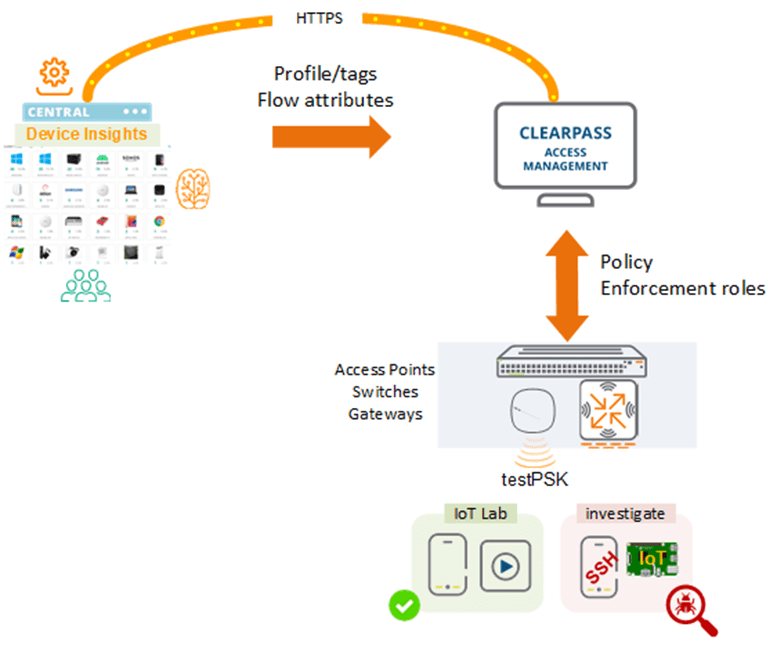This technote covers integrating Aruba Classic Central with ClearPass Policy, that enables Aruba Central to send the device profiling information and tags to ClearPass. Device Insight (DI) is part of the Aruba Central Platform and uses data collectors (APs, CX switches and gateways) that are on your network to continuously gather metadata and send them to Aruba Central for analysis.