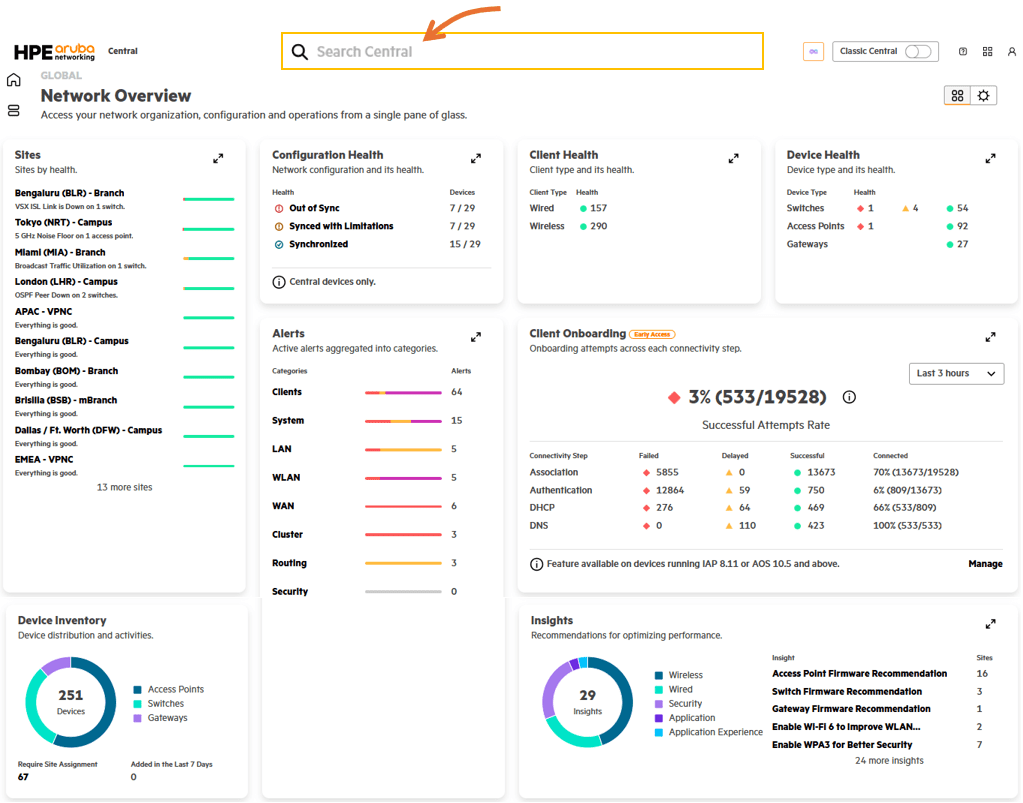 This technote explores the AI-powered search capabilities in HPE Aruba Networking Central, showcasing how Natural Language Processing (NLP) enables users to quickly locate network clients, devices, alerts, applications, and documentation. By using intuitive search queries, network administrators can simplify routine tasks such as inventory management, firmware tracking, troubleshooting, and performance monitoring.